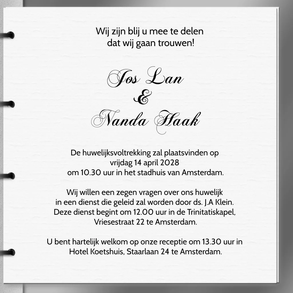 Zilveren uitnodiging huwelijk in boekvorm met sierlijke ornamenten