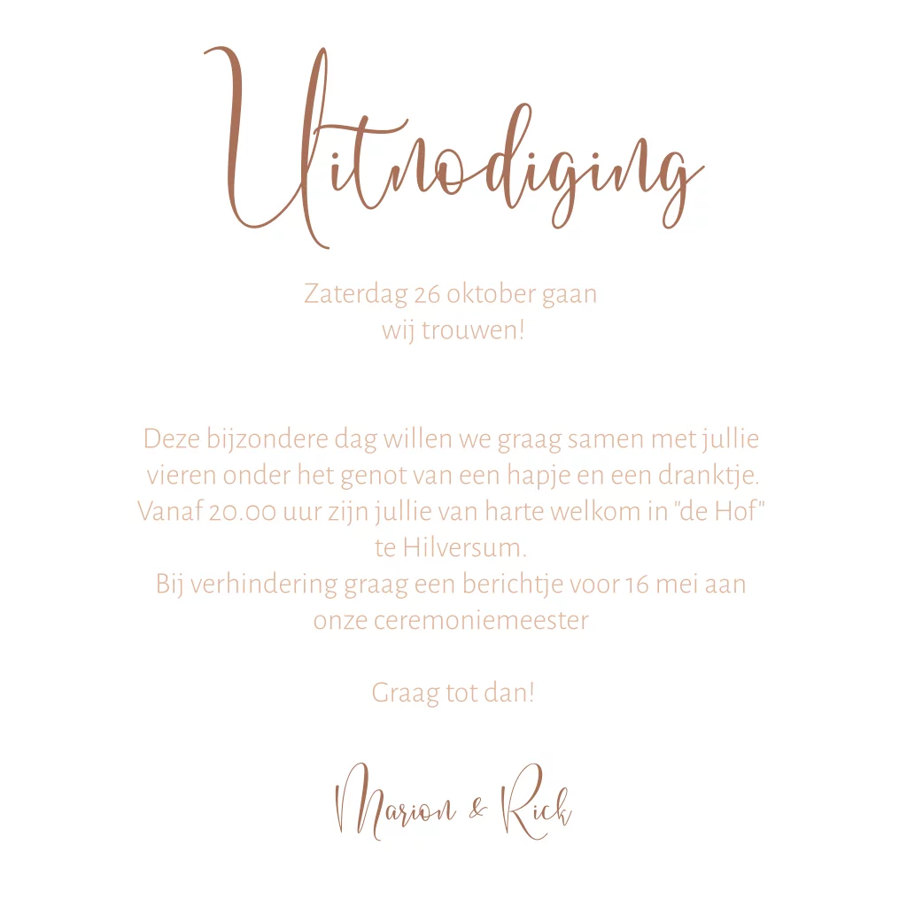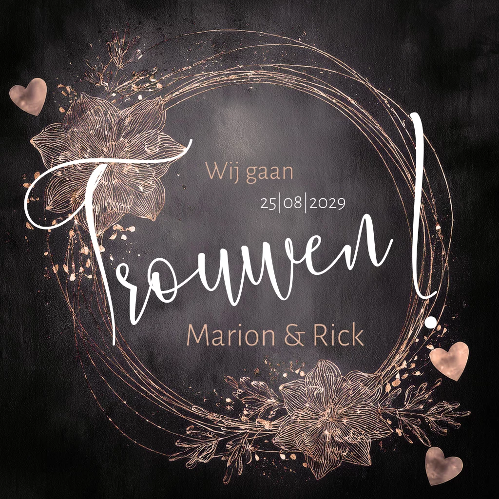 Trouwkaart met bloemen en hartjes in koper look