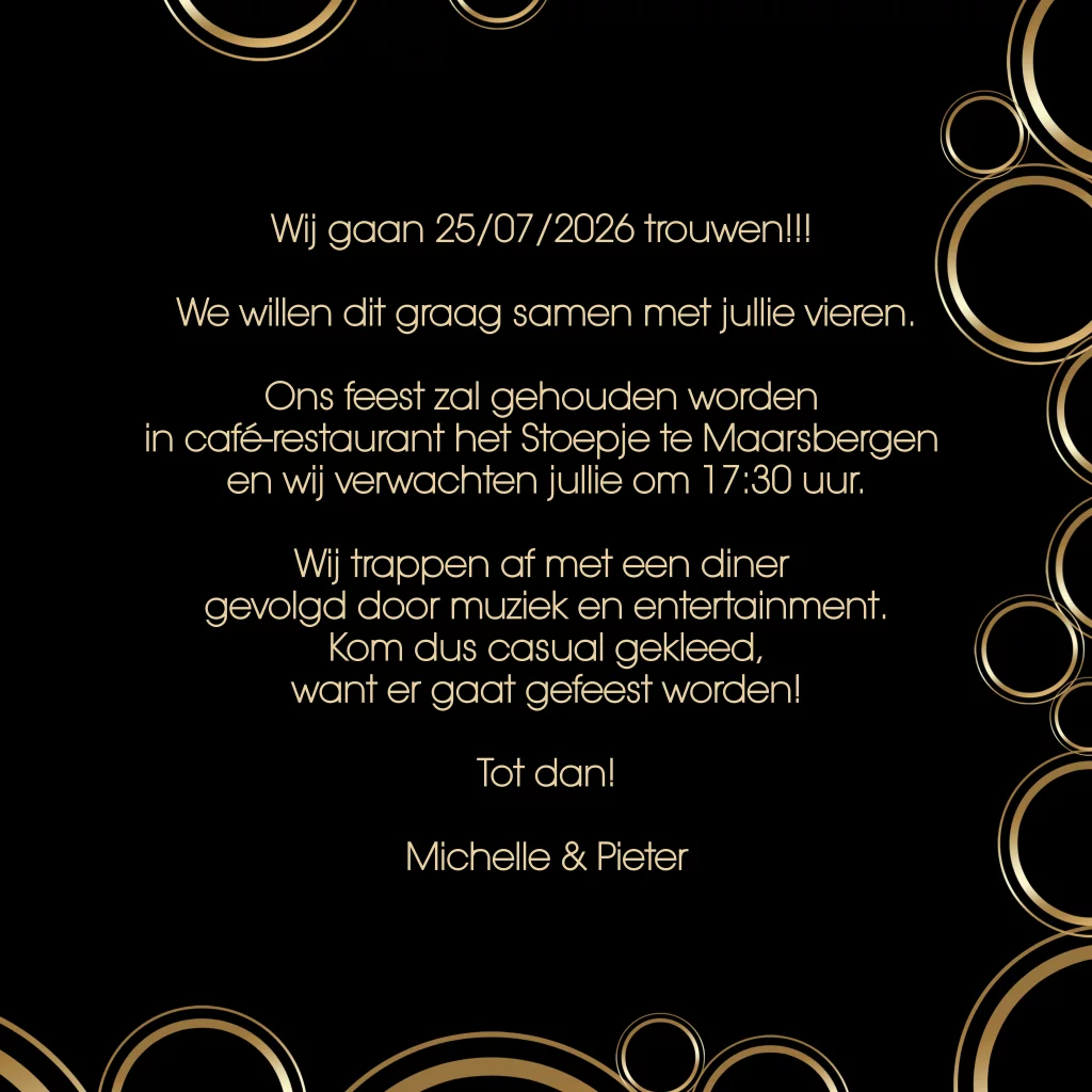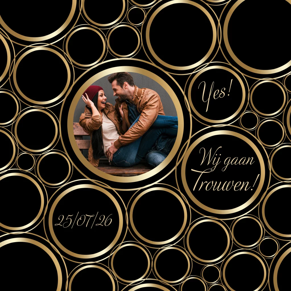 Een mooie moderne trouwkaart met goudlook cirkels en ruimte voor een eigen foto. (23809)