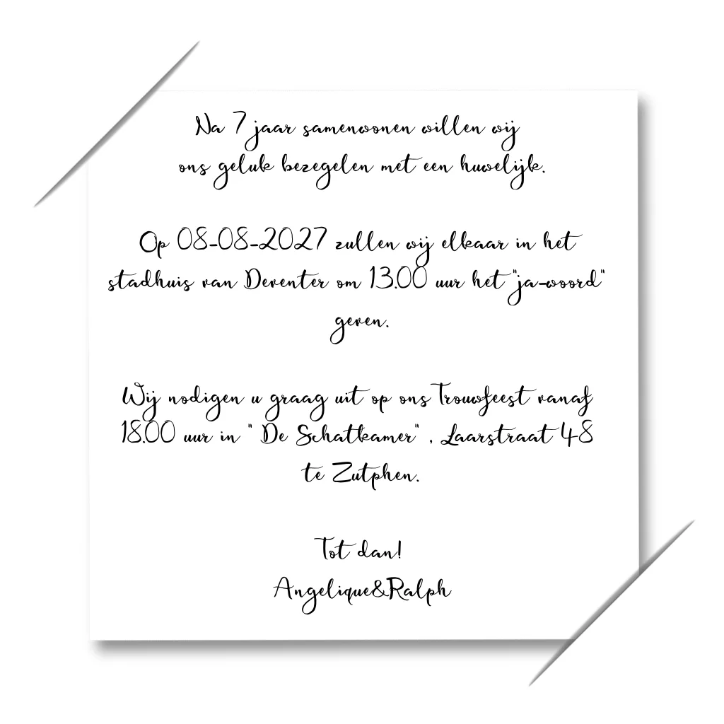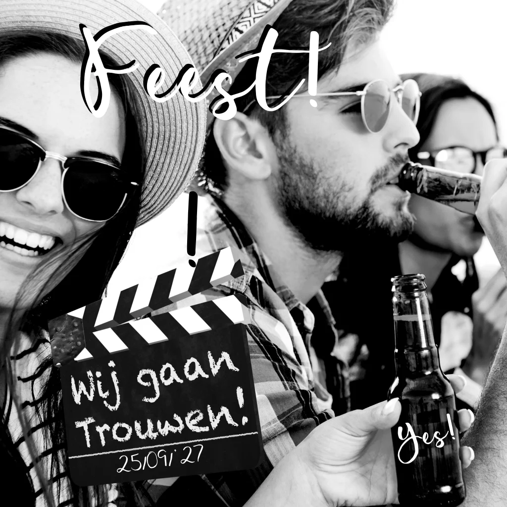 Een trendy trouwkaart met Clapperboard en foto. Klik op de verschillende teksten en pas aan. (8633)