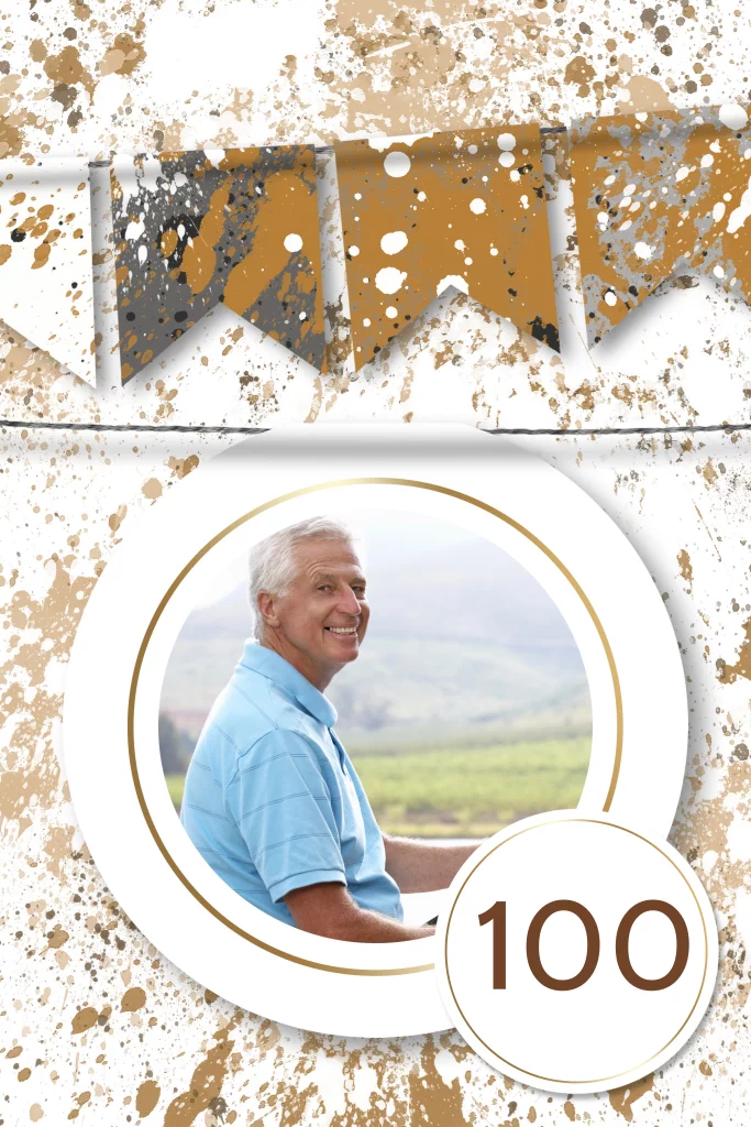Een feestelijke uitnodiging voor een 100e verjaardagsfeest met rond hangend label en slinger. De ronde button is verplaats en schaalbaar. (6511)