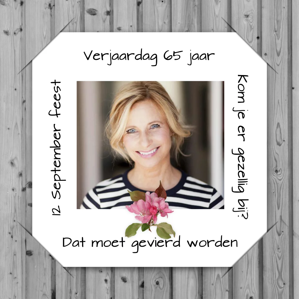 Uitnodiging 65 jaar vrouw met bloesem en foto