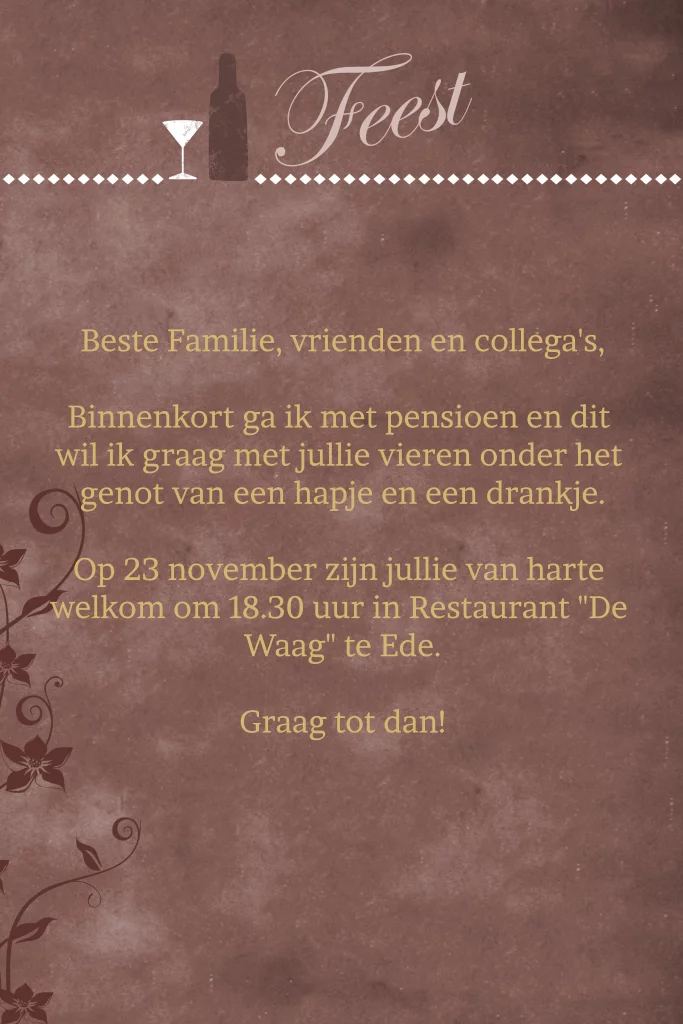 Uitnodiging feestje voor pensioen mooie typografie in licht bruin / terra kleur warme tinten (1553)