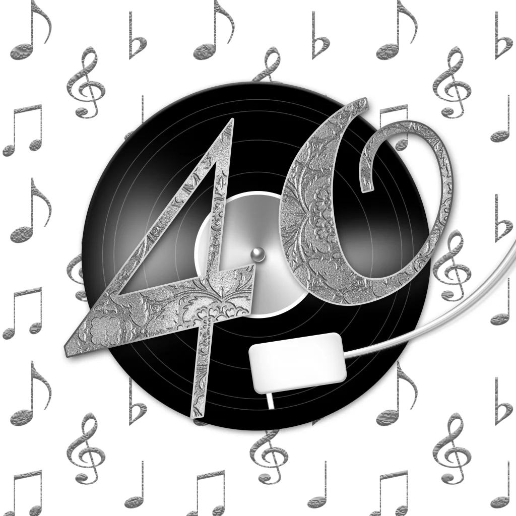Uitnodiging 40ste verjaardag met lp en zilver kleurige disco en muziek muzieknoten. (5449)