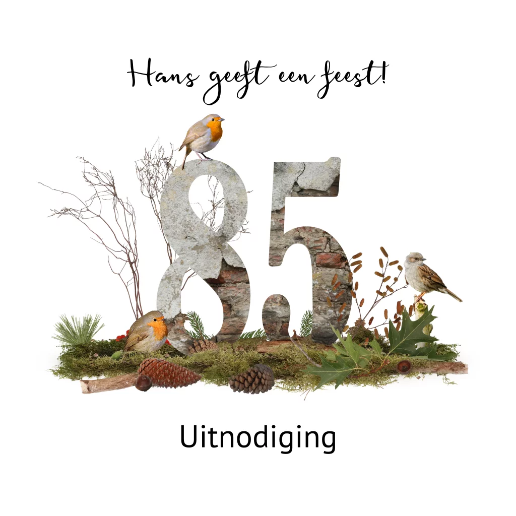 Een vrolijke kaart met een heideachtig tafereel. Vogeltjes, takjes en de cijfers 85 opgetrokken uit steen. (22764)