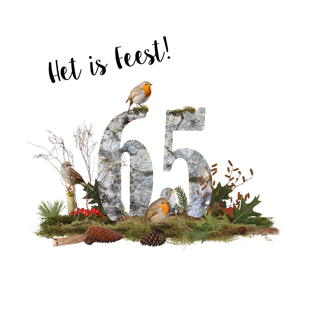 Een mooie kaart met de leeftijd 65 jaar in steen. Rondom een vrolijk natuur tafereel. (7965)