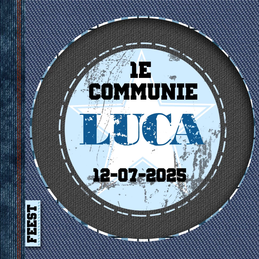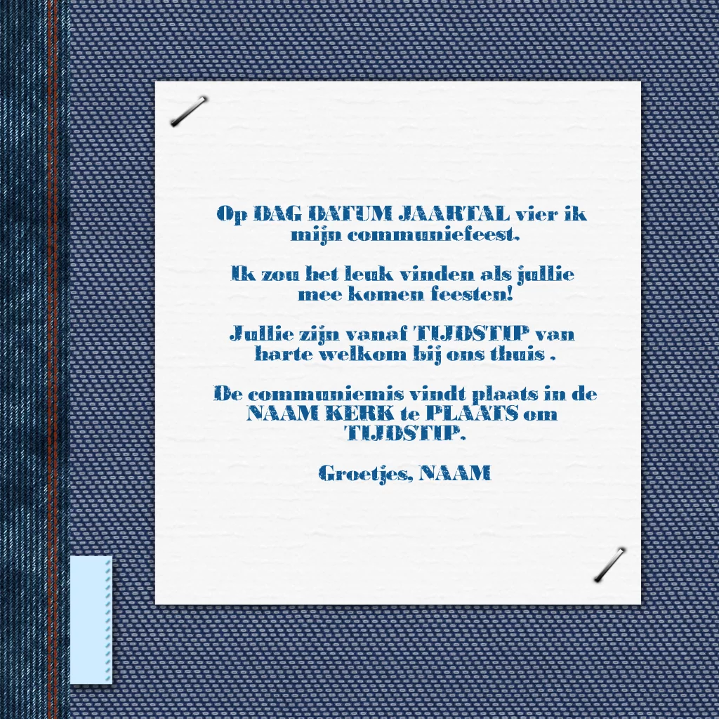 Stoere uitnodigingskaart denim voor 1e communie jongen met armyprint