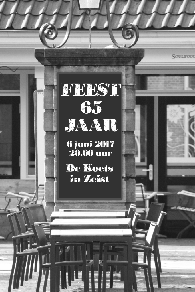 Uitnodiging voor 65 jaar Feest op krijtbord bij restaurant in zwart wit. Tafel en stoelen ervoor. (450)