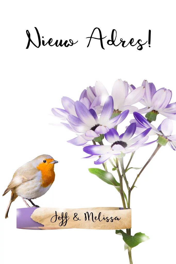 Een vrolijke verhuiskaart met een roodborstje op een label en paars witte bloemen. (7487)
