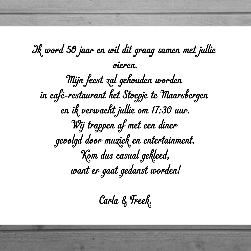 Een feestelijke uitnodigingskaart man 50 jaar met het jaartal 50 en foto aan een touw en slingers. Op de achtergrond hout. (6989)