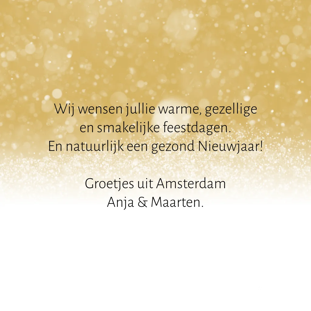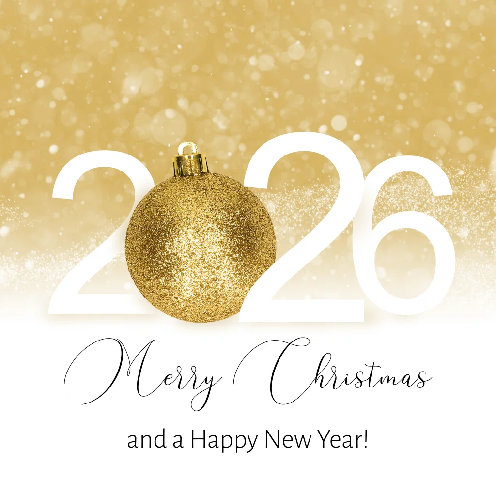 Zakelijke kerstkaart wit en goud-kleurig, met een glimmende kerstbal en jaartal. (23834)
