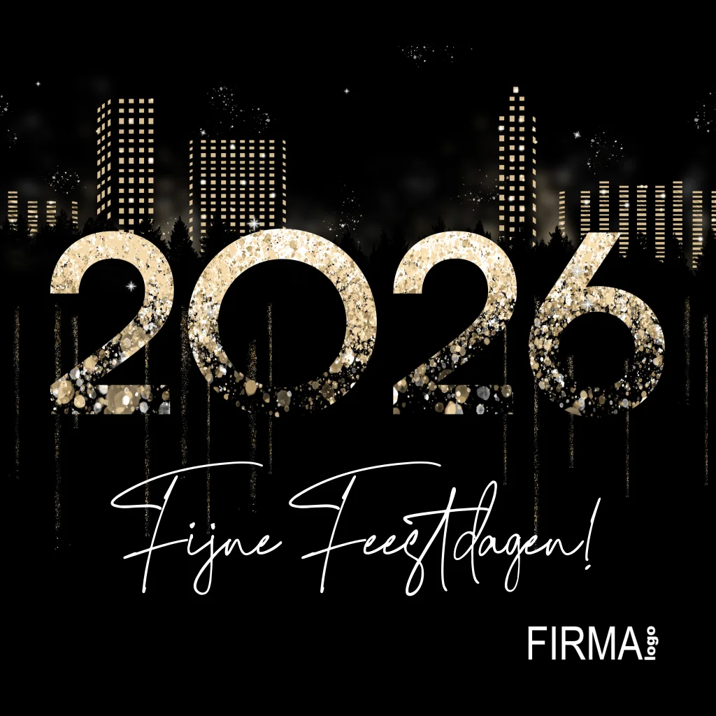 Een mooie kerstkaart met groot het jaartal 2026 en de skyline van een stad op de achtergrond. (24328)