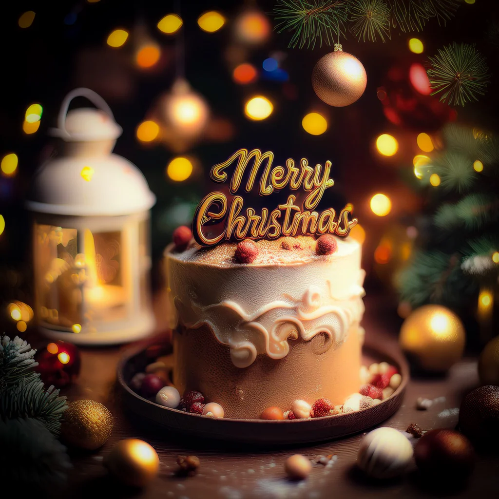Een warm sfeervol kaartje met een taart, kerstballen en een lantaren op een houten tafel. (24149)
