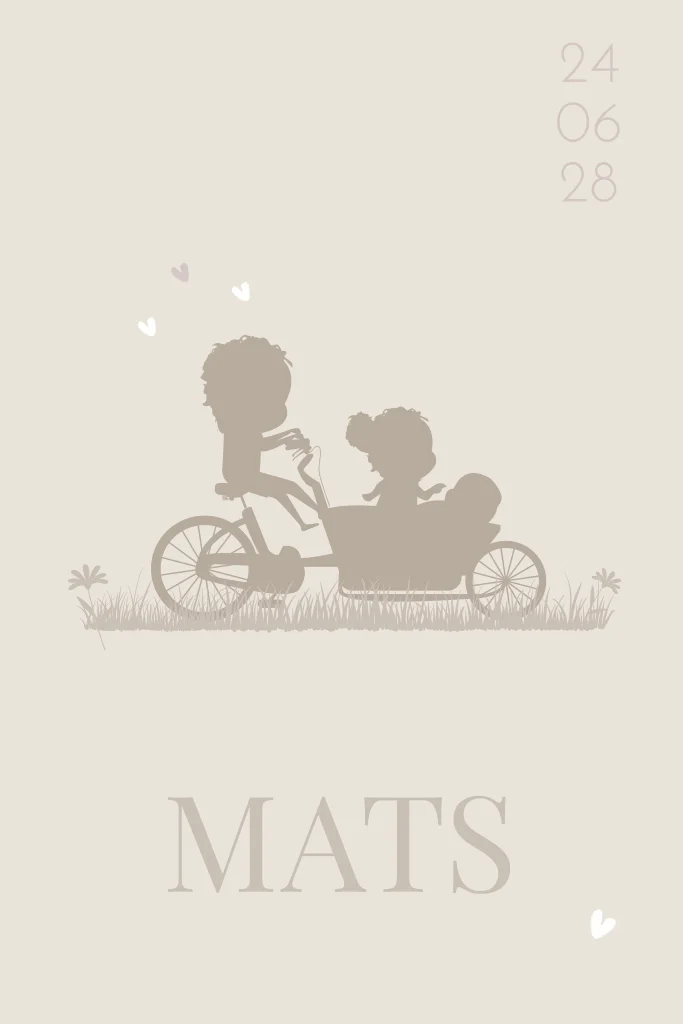 Geboortekaartje voor een derde kindje met een grote broer en grote zus in de bakfiets met baby broertje. (23943)