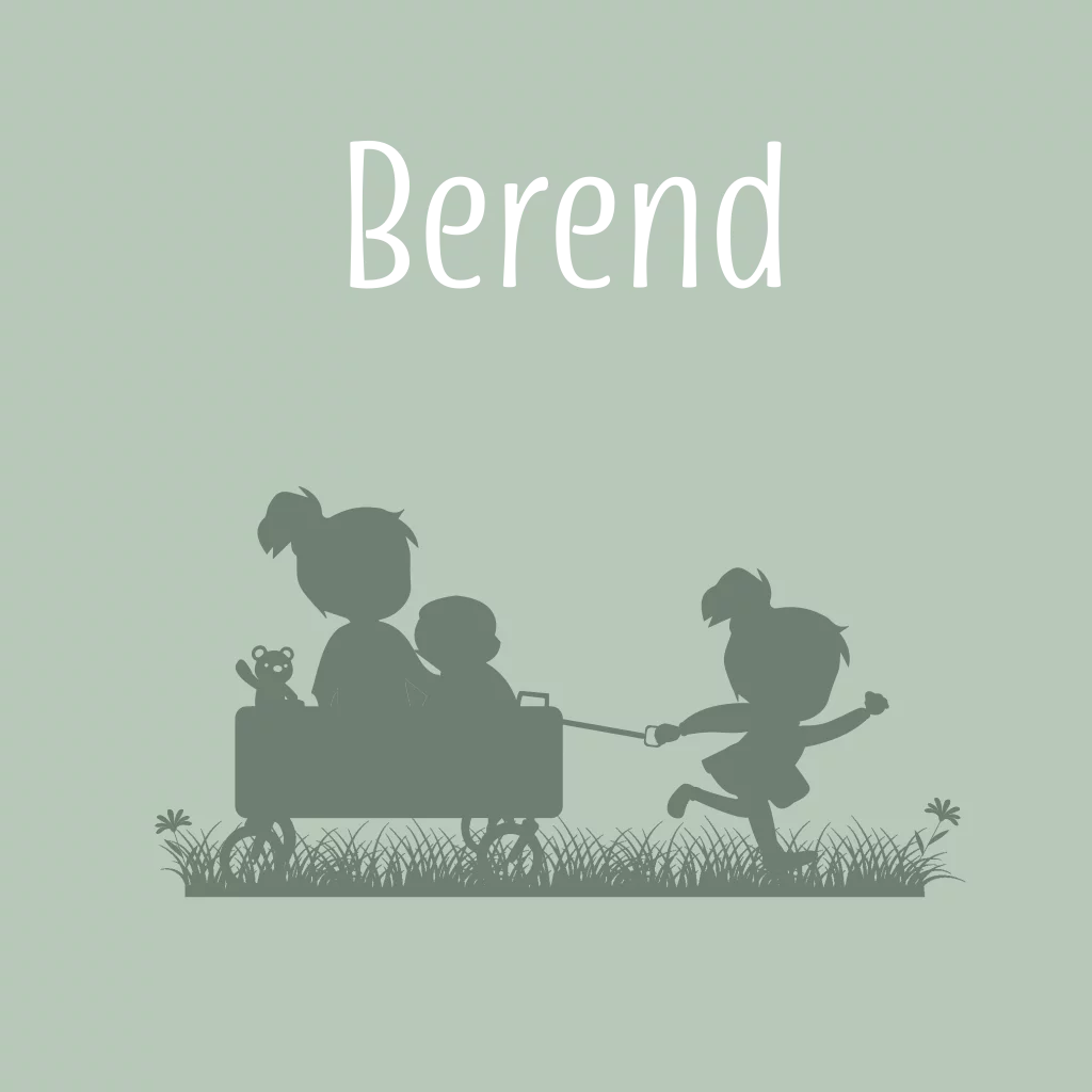 3e kindje geboortekaartje voor een baby jongen. Met een tekening van een zus die haar zusje en broertje voorttrekt in een bolderkar bolderwagen. (24335)