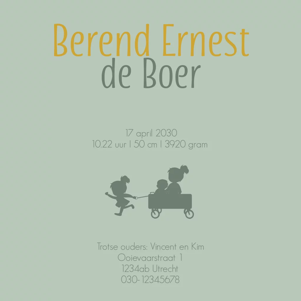 Geboortekaartje derde kindje jongen in bolderkar met zussen