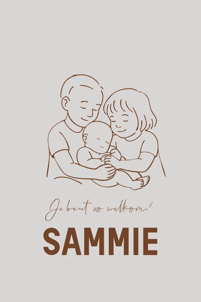 Lief geboortekaartje voor een 3e kindje met familie-illustratie. Een grote broer en zus die baby meisje of jongetje vasthouden. (30090)