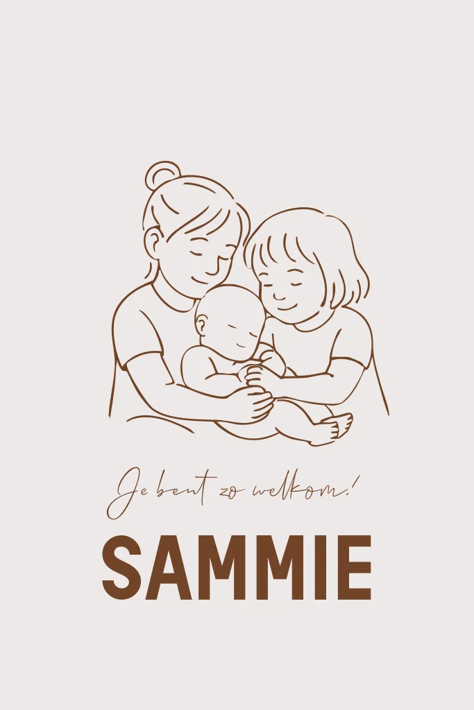 Geboortekaartje 3e kindje meisje of jongetje lijntekening grote zussen