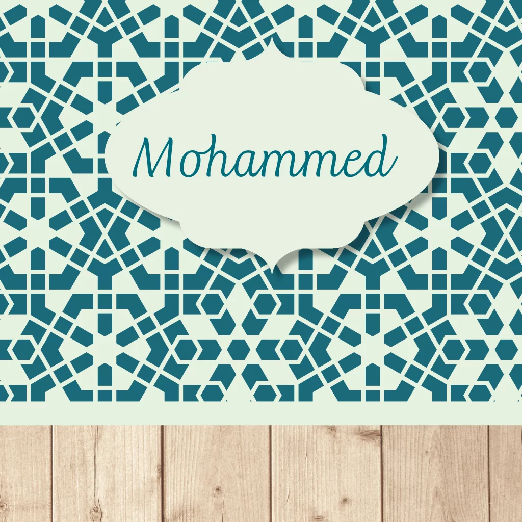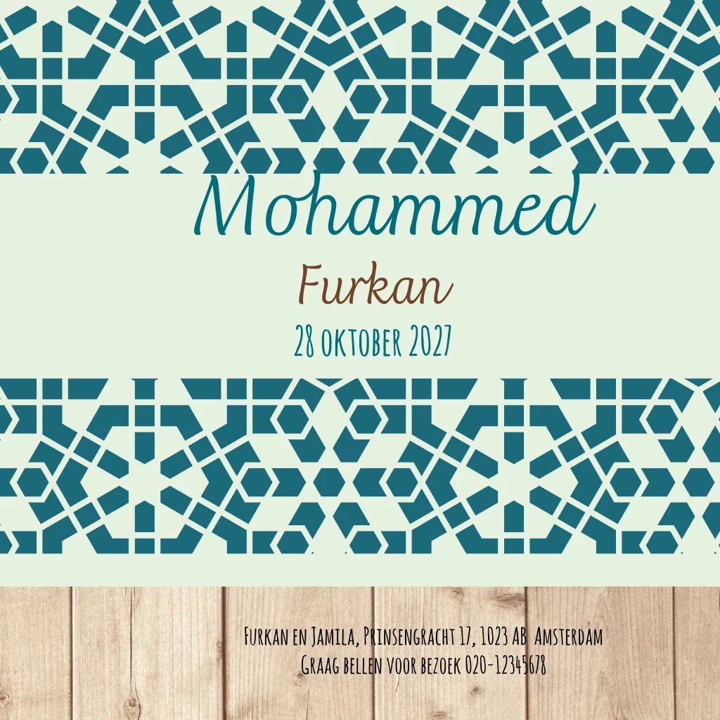 Islamitisch geboortekaartje jongen arabisch tegeltje. Met donkerblauw en lichtblauw en houten planken. (3966) Geboortekaartje Mohammed