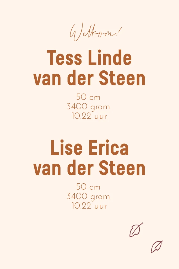 Vrolijk geboortekaartje voor tweeling met herfstthema. (30082) Deze kaart heeft ronde hoeken, maar kan ook met rechte hoeken ( - 0,30 per kaartje)