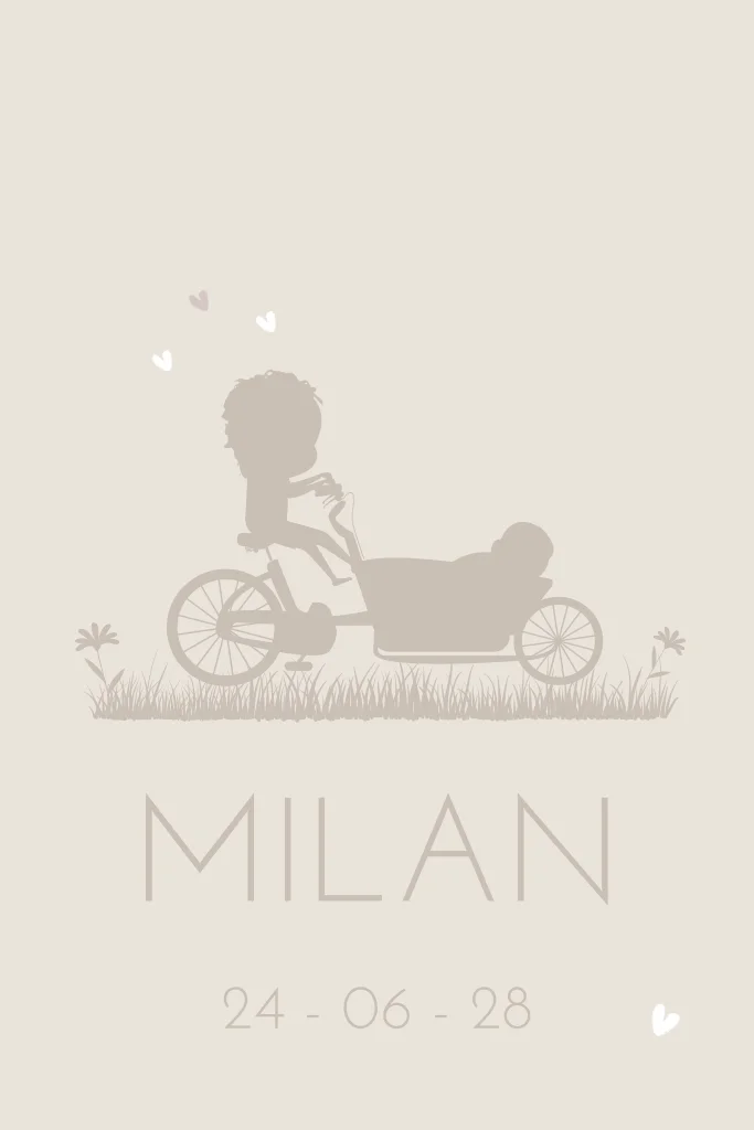 Silhouet geboortekaartje tweede kindje jongen met bakfiets