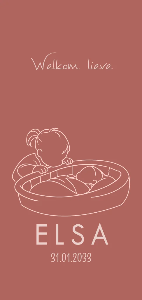 Geboortekaartje voor een tweede kindje met 2 meisjes. De grote zus kijkt lief in een mandje / wiegje. Het is een langwerpige kaart 21 cm hoog en 10 cm breed met lijntekening aan de voorkant (30360)