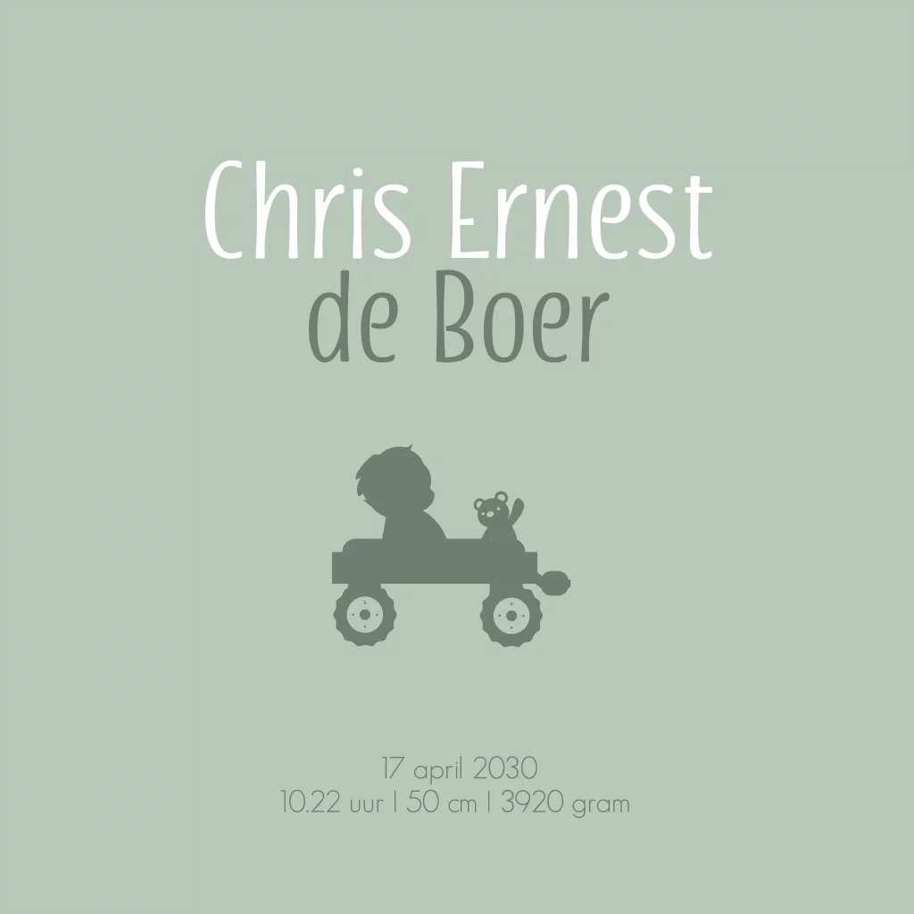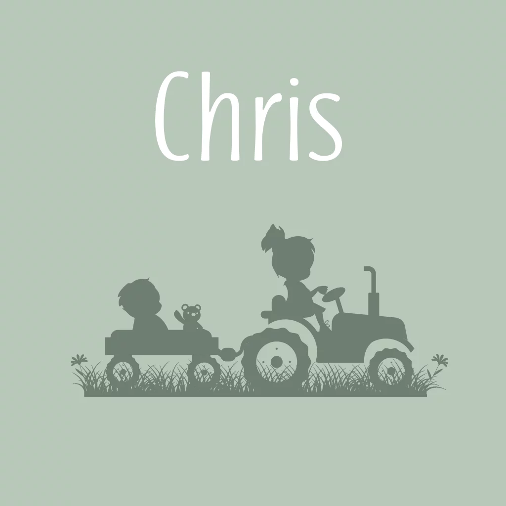 Geboortekaartje voor een 2de kindje een jongen met een grote zus die haar broertje voorttrekt met een tractor. (24436)