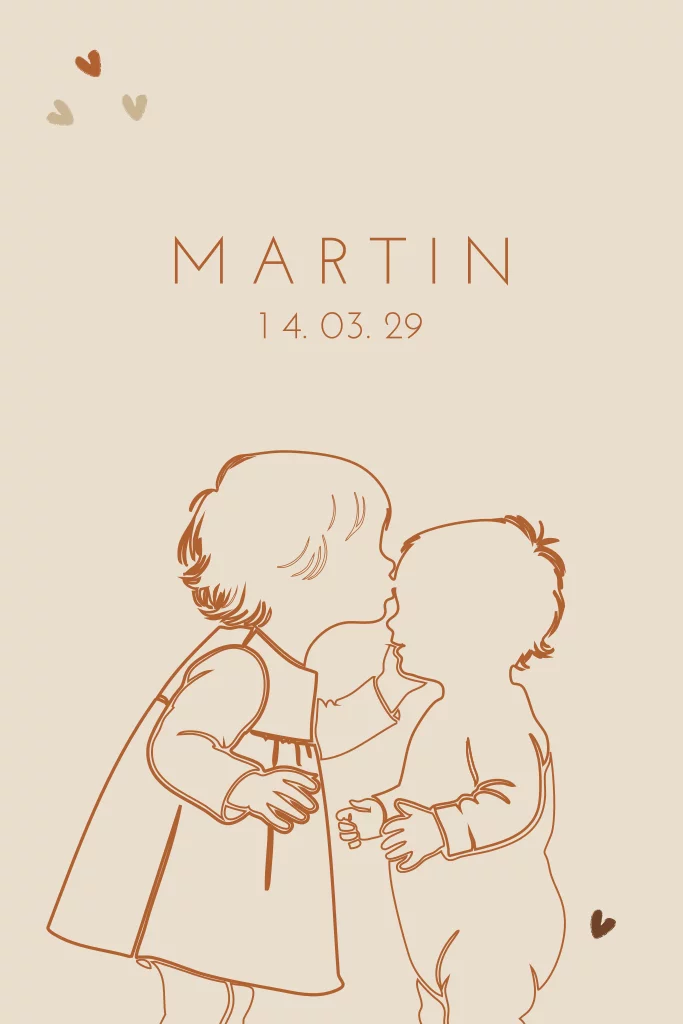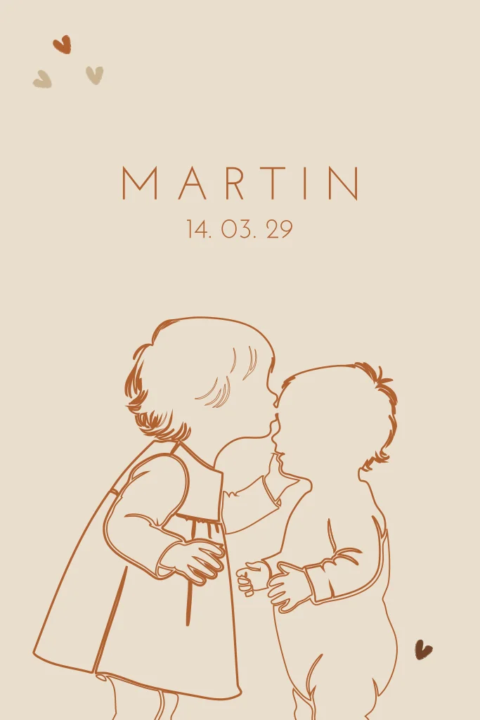 Lief geboortekaartje voor een tweede kindje met een silhouet/lijntekening van een grote zus die haar baby broertje een kusje geeft. (30089)
