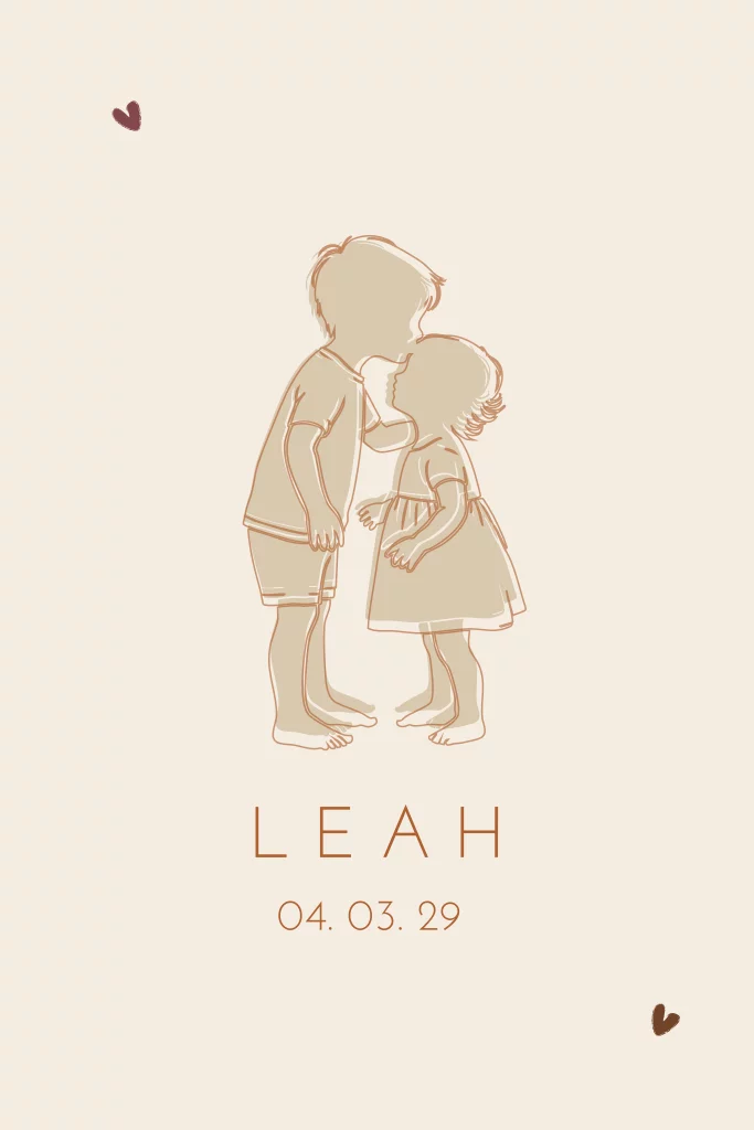 Geboortekaartje voor een tweede kindje een meisje. Met een silhouet van een grote broer die zijn zusje een kus geeft. (24660)