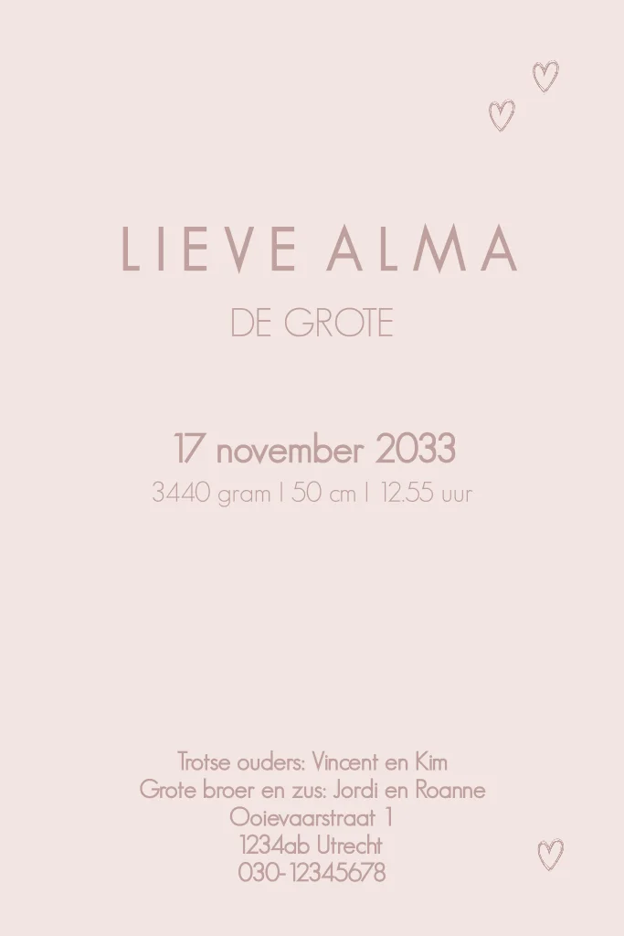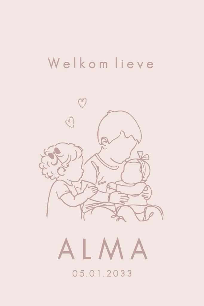 Schattig getekend derde kindje geboortekaartje voor een meisje met broer en zus. Pas het ontwerp qua kleur en letters eenvoudig aan in onze online (30403)