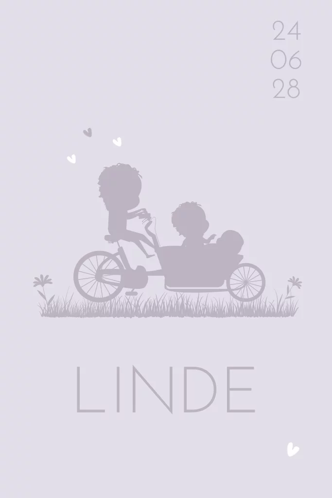 Lief geboortekaartje voor een 3de kindje met 2 grote broers en een baby zusje in een bakfiets. (23946)