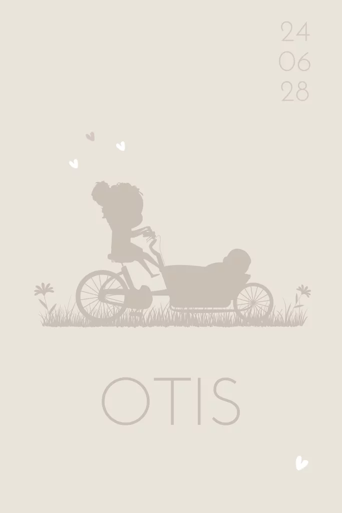 Geboortekaartje 2e kindje jongen met een silhouet van een grote zus die met haar kleine broertje in de bakfiets fietst. (23943)