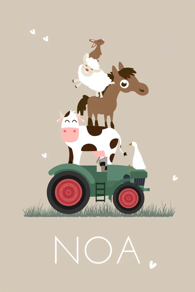 Vrolijk en lief getekend geboortekaartje met een grappige koe, paard, schaap, konijn en gansje. (24438) (Deze kaart heeft nu ronde hoeken a € 0,30 extra per kaart, in je kunt dit ook met rechte hoeken bestellen)