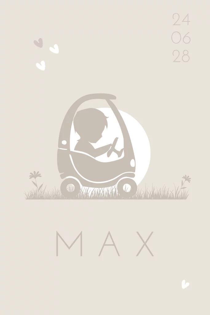 Geboortekaartje zandkleur jongetje in speelgoedautootje