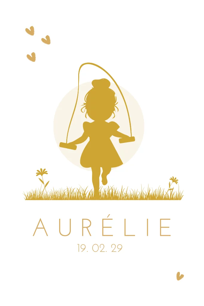 Lief geboortekaartje met een silhouet van een meisje dat aan het springtouwen is. (24582) . Deze geboortekaart heeft ronde hoeken, maar kan ook met rechte hoeken ( - € 0,30 per kaartje).
