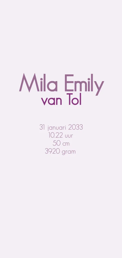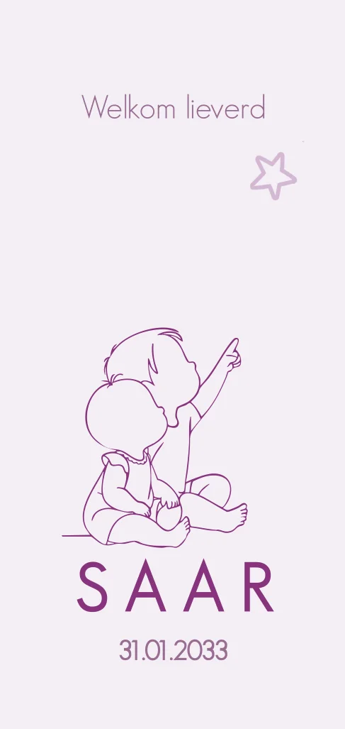 Een lief paars geboortekaartje om je baby te verwelkomen. Pas het ontwerp aan naar wens in onze online editor.