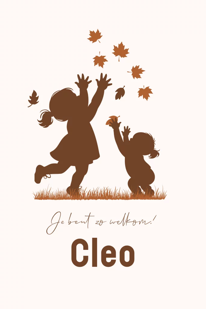 Geboortekaartje 2e kindje herfst zusjes spelen bladeren silhouet