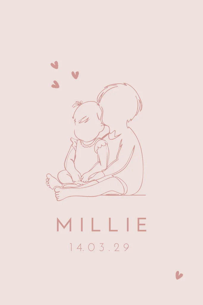 Een lief geboortekaartje voor een meisje, met een subtiele lijntekening van haar en haar grote broer samen. Het ontwerp heeft een zachte, tijdloze uitstraling en kun je eenvoudig aanpassen naar eigen wens in onze online editor. (24812)