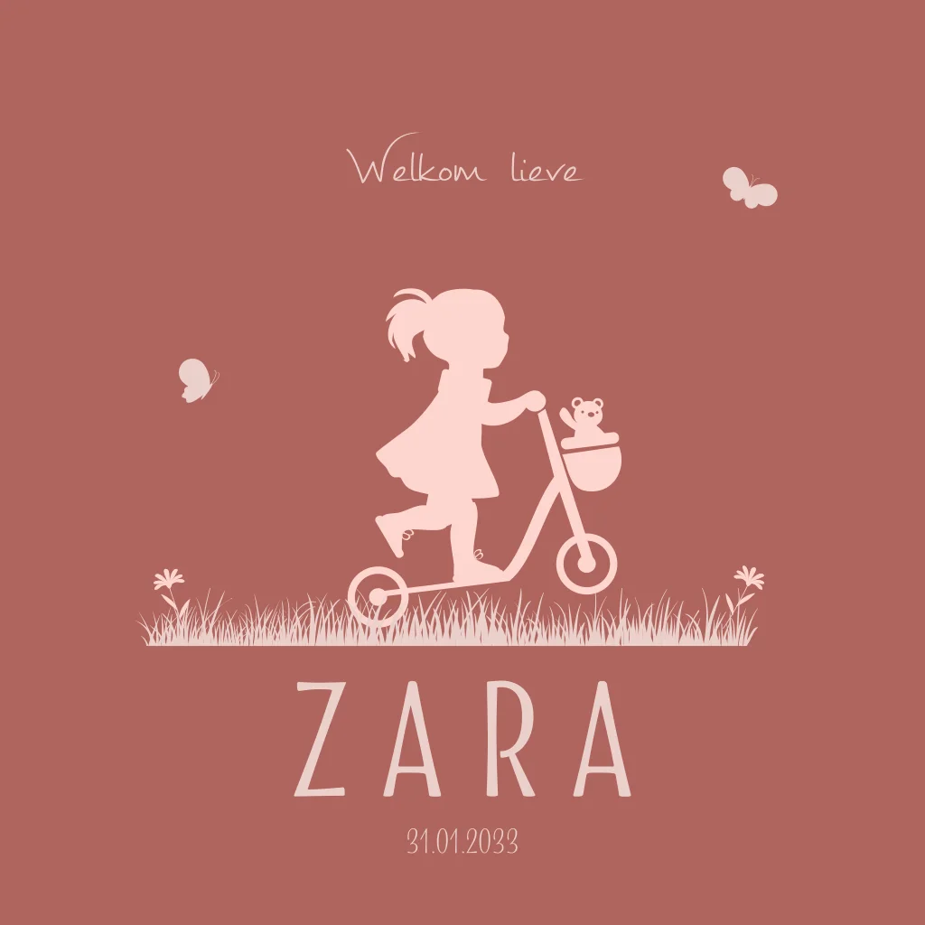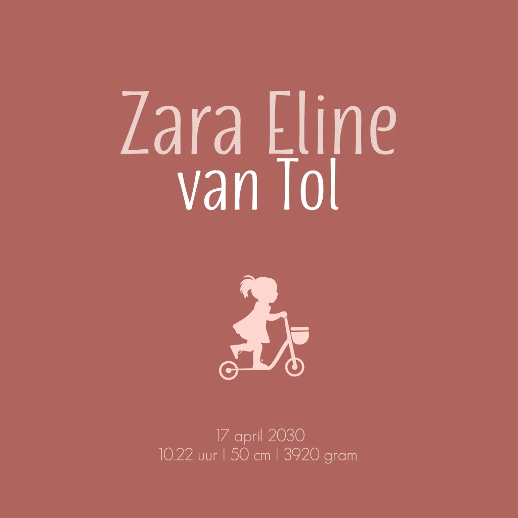 Getekende geboortekaartje meisje met een meisje op een stuntstep. (24509)