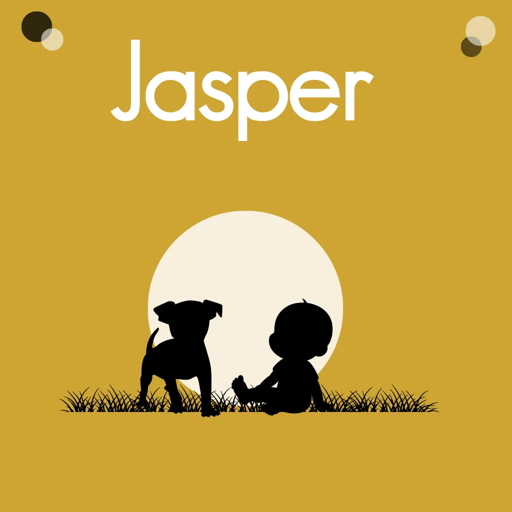 Geboortekaartje jongen met een silhouette van een kleine baby jongetje en een hondje. (23546) De afbeelding van de hond is te vervangen door een andere hond.