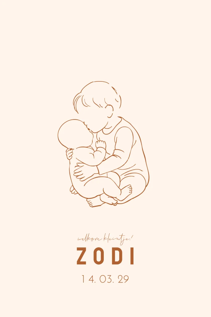 Geboortekaartje voor een jongetje of meisje met een silhouet van een grote broer die zijn baby broertje of zusje knuffelt en een kusje geeft. lief in aardetinten. (30169)