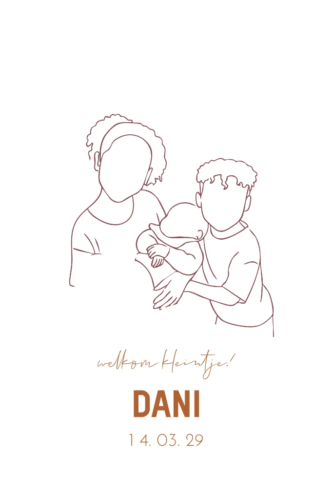 Geboortekaartje voor een 3e kindje. Een jongetje of een meisje met een lijntekening van een grote broer en zus met krullen die hun baby broertje of zusje vasthouden. (30115) Deze kaart heeft ronde hoeken, maar kan ook met rechte hoeken ( - 0,30 per kaartje)