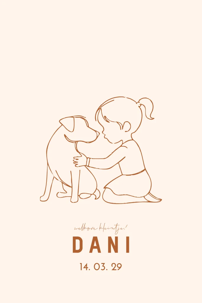 Geboortekaartje voor een meisje in natuurtinten met een lieve lijntekening van een kindje met een hond. (30198) Deze kaart heeft ronde hoeken, maar kan ook met rechte hoeken ( - 0,30 per kaartje)