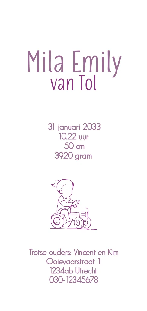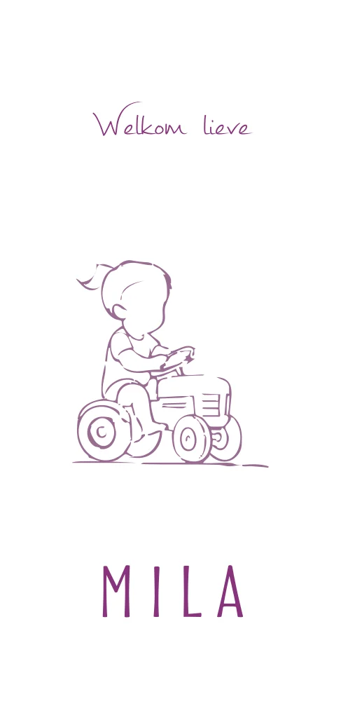 Langwerpig staand geboortekaartje meisje paars / lila met wit met een lijntekening van een meisje op tractor. (30309)