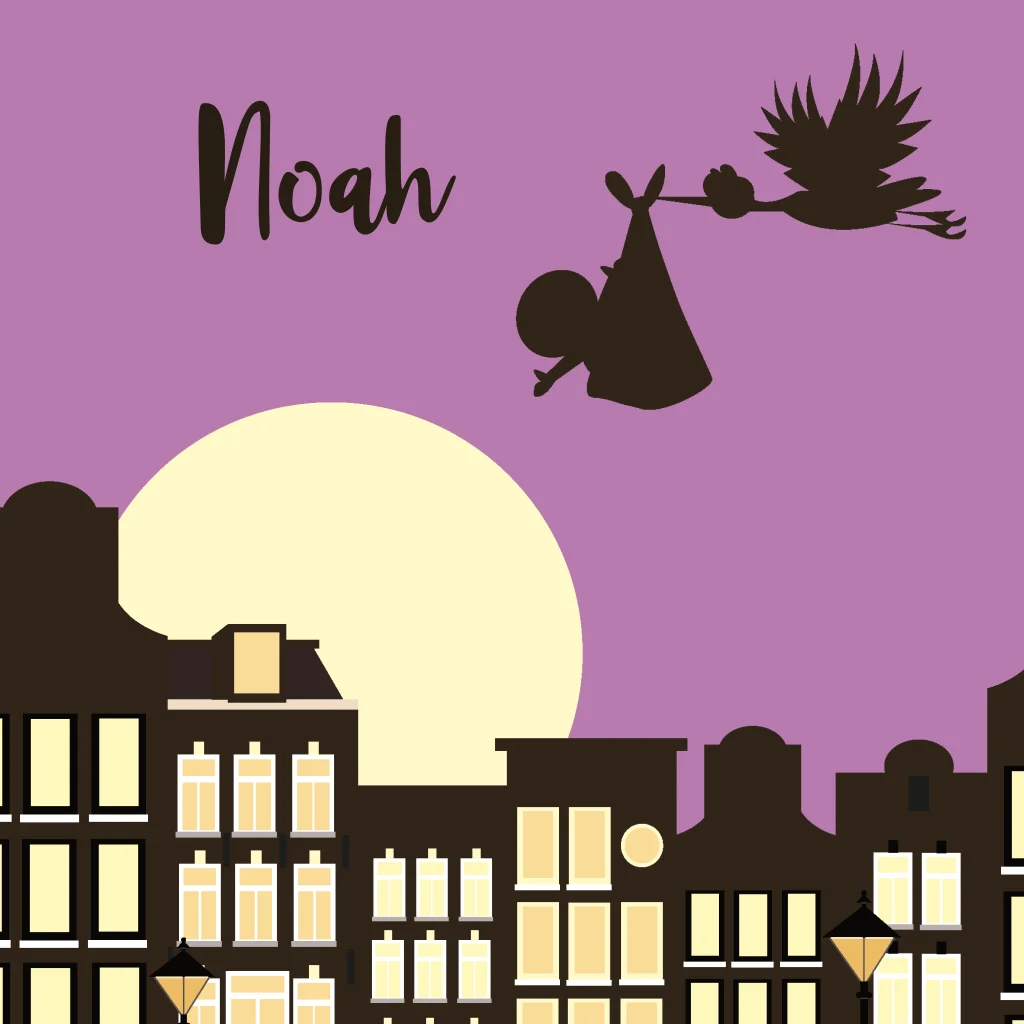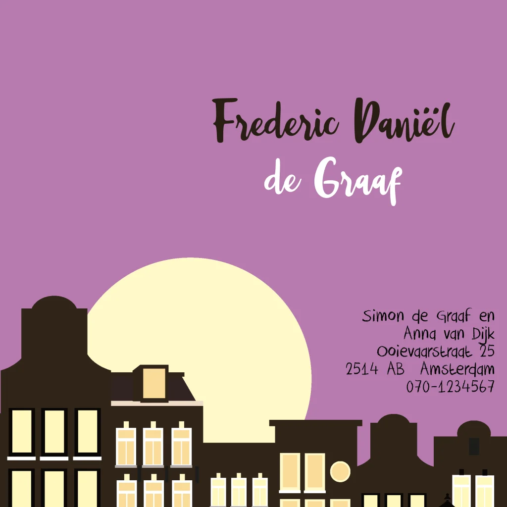Geboortekaartje jongen getekend met amsterdamse grachtenpanden