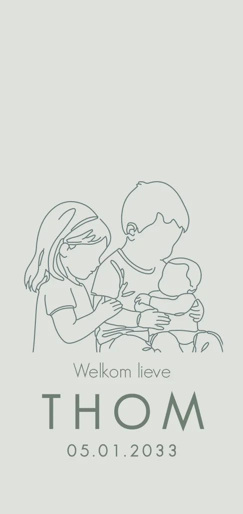 Een warm en liefdevol geboortekaartje met een minimalistische lijntekening van een grote zus en broer die hun kleine broertje knuffelen. Het ontwerp heeft een zachte en rustige uitstraling en is eenvoudig naar wens aan te passen in onze online editor. (24818)