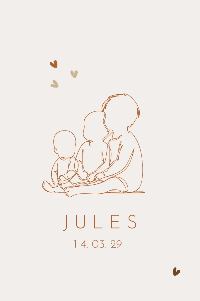 Geboortekaartje 3 broers met baby lijntekening silhouet