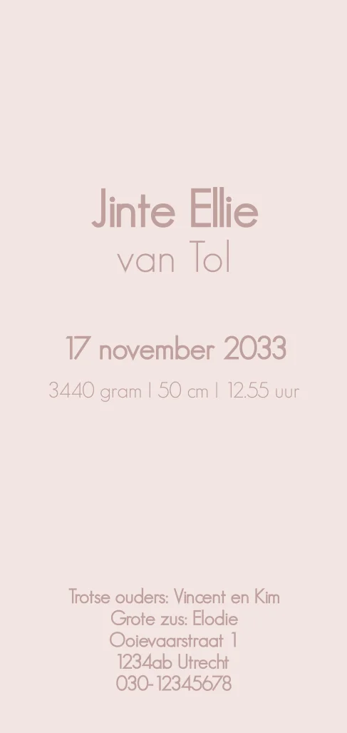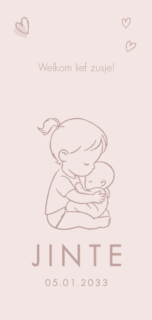 Meisjes geboortekaartje in roze voor de geboorte van een 2de kindje. Een grote zus met staartje heeft een baby meisje in de armen. De kleuren kunnen naar wens aangepast worden.