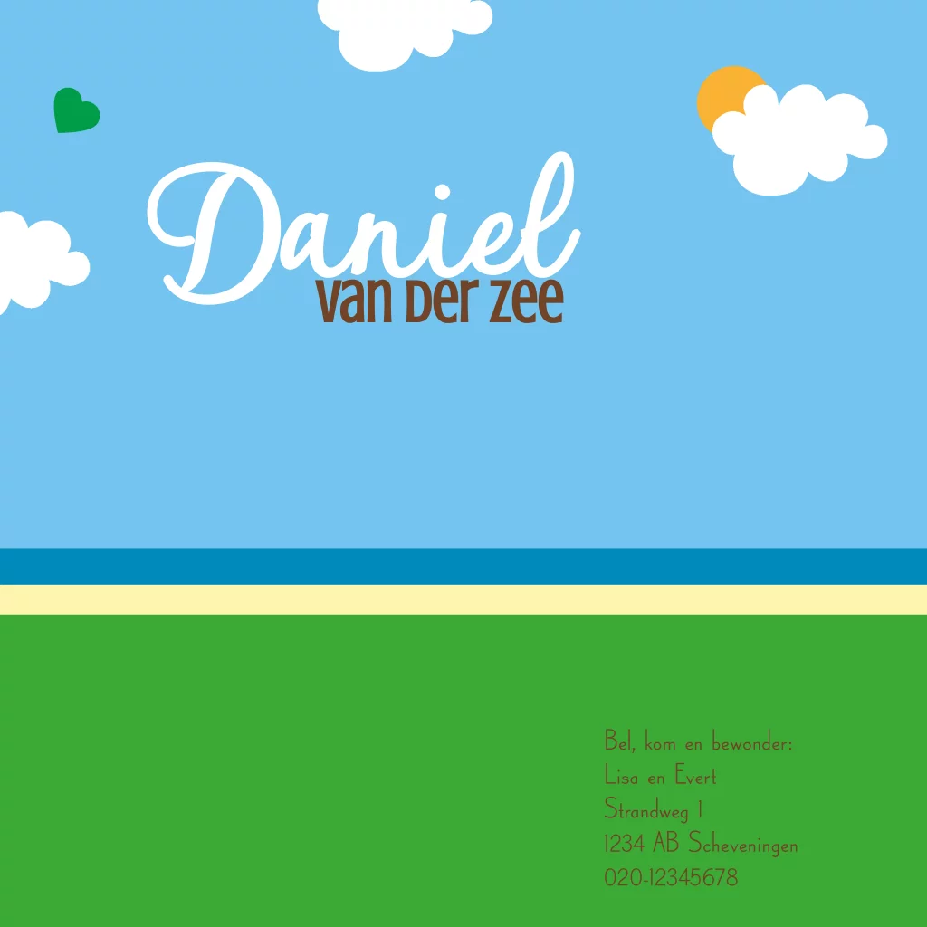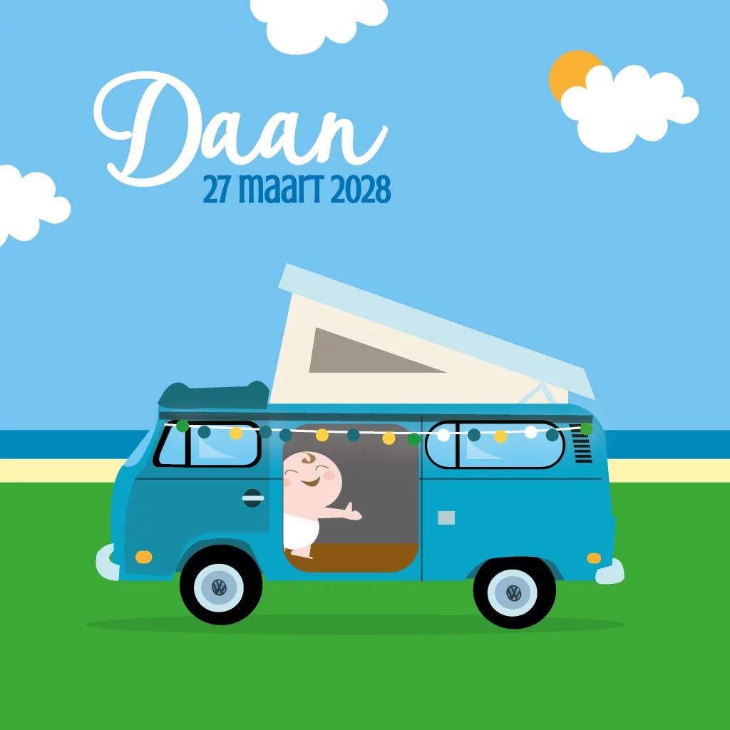 Hip geboortekaartje voor een jongetje met een stoer getekend volkswagen busje dat op een camping aan zee geparkeerd is. (10181)
