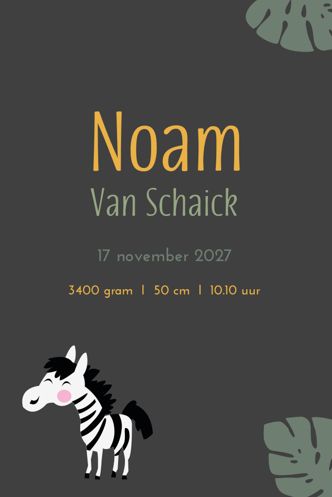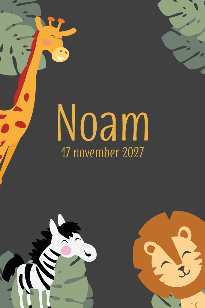 Jungle geboortekaartje leeuw giraffe zebra donker